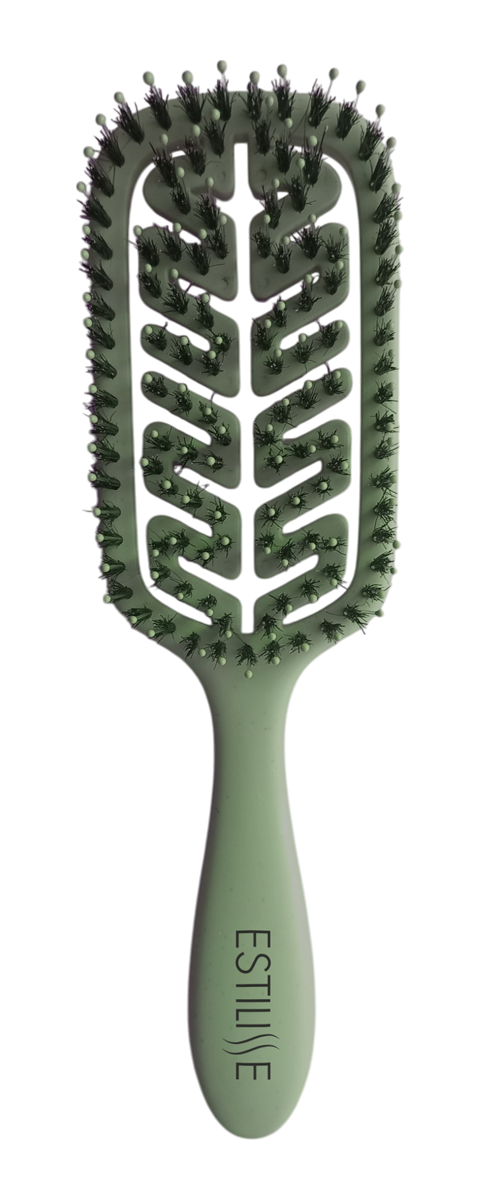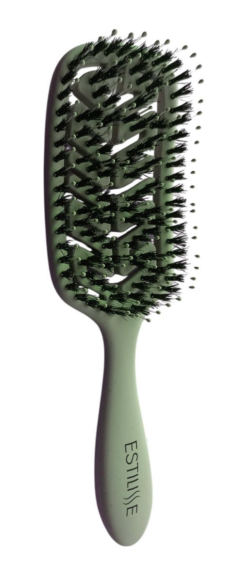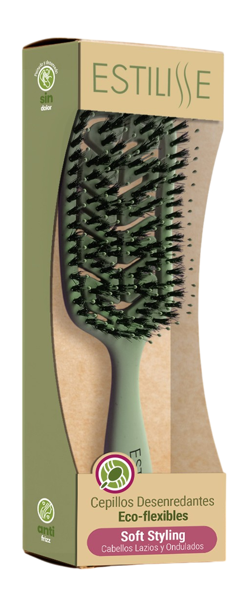 Los cepillos eco-flexibles para el cabello ESTILISSE están hechos con material PCR reciclados 100%. Su exclusivo diseño flexible otorga un peinado suave y desenredante sin dolor, pudiéndose usar tanto en cabellos húmedos como secos.